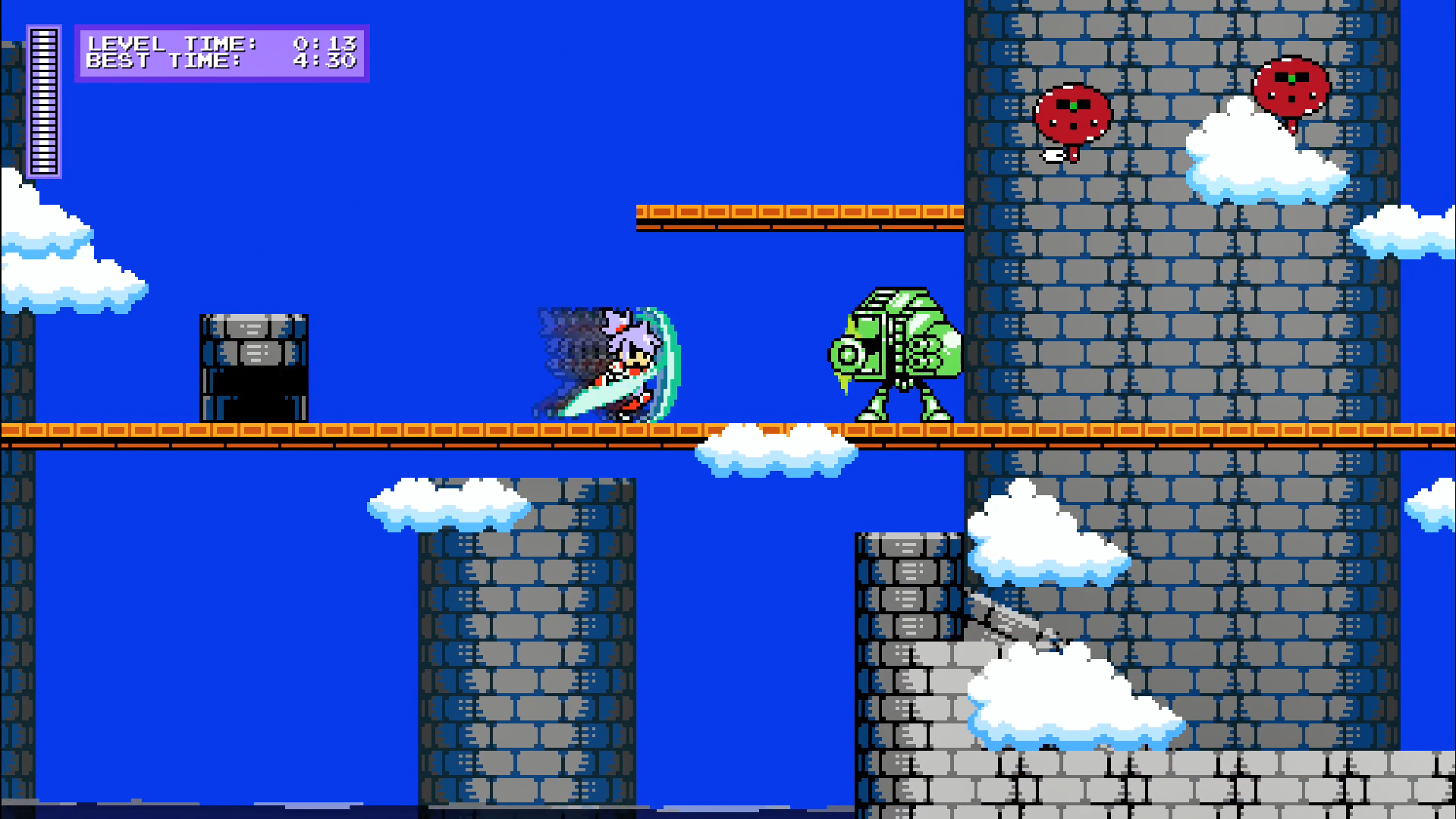 You have an HP bar and a saber. But the majority of the time, you’ll be using slides, down-thrusts, spiral jumps, and other awesome attacks as you blaze through the level. It’s a very refreshing retro platform adventure.